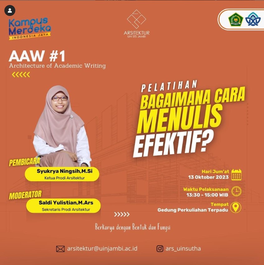 Program Studi Arsitektur UIN Sultan Thaha Saifuddin Jambi menyelenggarakan kegiatan Architecture of Academic Writing Seri 1 bertajuk “Bagaimana Cara Menulis Efektif?” pada hari Jumat, 13 Oktober 2023, pukul 13.30–15.00 WIB di Gedung Perkuliahan Terpadu. Kegiatan ini dihadiri oleh mahasiswa lintas prodi dan menjadi pembuka dari rangkaian program penguatan literasi akademik di lingkungan prodi.