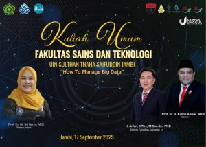 Kota Jambi, 17 September 2025 – Fakultas Sains dan Teknologi Universitas Islam Negeri Sulthan Thaha Saifuddin (UIN STS) Jambi kembali menggelar kegiatan kuliah umum yang inspiratif dan penuh wawasan. Bertajuk “How to Manage Big Data”, kegiatan ini diselenggarakan pada Jum’at, 17 September 2025, dengan menghadirkan narasumber Prof. Dr. Hj. Sri Harini, M.Si. dari UIN Maulana Malik Ibrahim Malang.