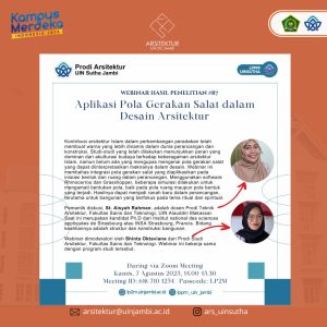 Acara yang dimoderatori oleh Shinta Oktaviana, S.T., M.P.W.K., dosen Arsitektur UIN STS Jambi, ini bertujuan untuk mengeksplorasi bagaimana gerakan shalat dapat menjadi inspirasi dalam mendesain bentuk dan ruang arsitektur secara inovatif.