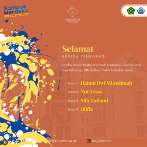 Program Studi Arsitektur, Fakultas Sains dan Teknologi, Universitas Islam Negeri Sulthan Thaha Saifuddin (UIN STS) Jambi mengucapkan selamat dan apresiasi setinggi-tingginya kepada para mahasiswa yang telah meraih prestasi dalam Lomba Desain Poster Visi Program Studi Arsitektur.